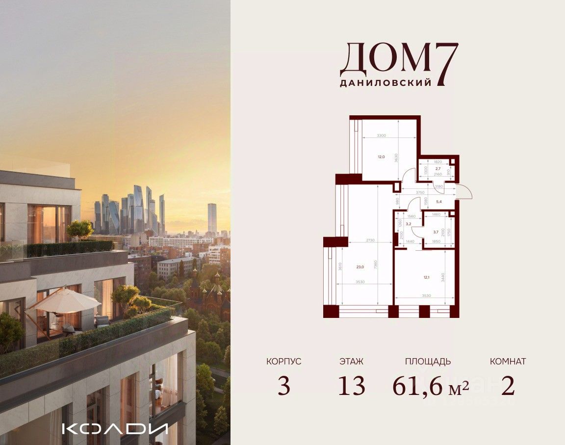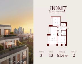Продается 2-к квартира общей площадью 61.60 кв.м на 13 этаже в жилом квартале премиум-класса "Дом 7 Даниловский".