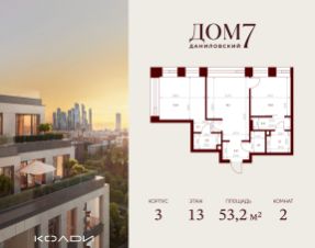 Продается 2-к квартира общей площадью 53.20 кв.м на 13 этаже в жилом квартале премиум-класса "Дом 7 Даниловский".