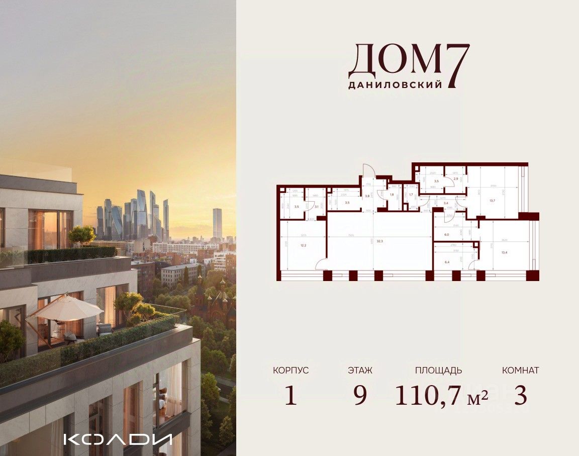 Продается 3-к квартира общей площадью 110.70 кв.м на 9 этаже в жилом квартале премиум-класса "Дом 7 Даниловский".