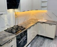 Выполнена в светлых тонах, белые двери, плитка в ванной под мрамор, на кухне фартук тоже из плитки.