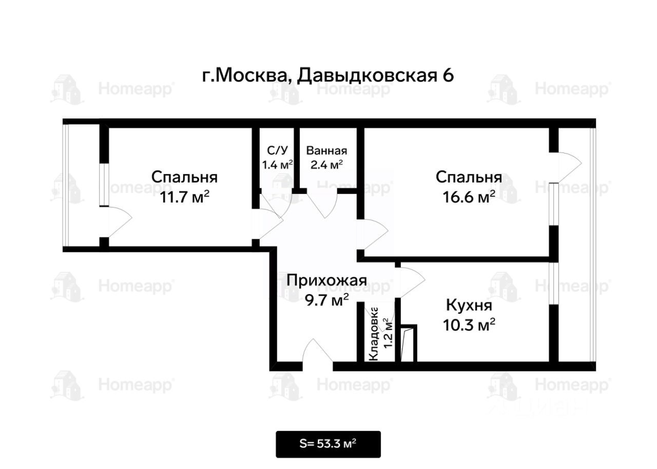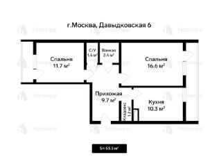 Общая площадь составляет 59 м² (с учётом лоджий), без учёта — 53,3 м². Квартира расположена на 2 этаже 16-этажного панельного дома, удачной распашной планировки, с просторной кухней.
