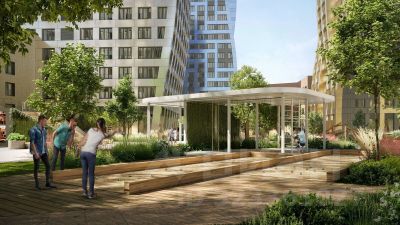 Вся площадь двора-парка будет огорожена и составит более 2 га, из которых 45% - озеленение. Одним из самых важных ландшафтных элементов здесь станет небольшая речка, наполняющаяся во время дождя. Вокруг неё появится сеть из островов, внутри которых расположатся тематические зоны спорта и отдыха.