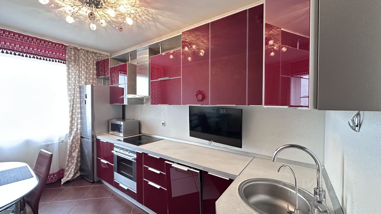 Кухня оснащена всей необходимой техникой для приготовления пищи: посудомоечная машина, фильтр для чистой воды, электрический духовой шкаф и индукционная плита, мощная вытяжка, холодильник.