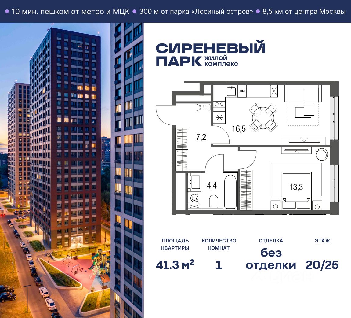 Продаётся просторная 1-комнатная квартира общей площадью 41.3 м² на 20 этаже в новом жилом комплексе "Сиреневый парк", расположенном в Восточном административном округе Москвы на улице Тагильская. Всего 10 минут ходьбы от станции метро "Бульвар Рокоссовского" и одноимённой платформы МЦК.