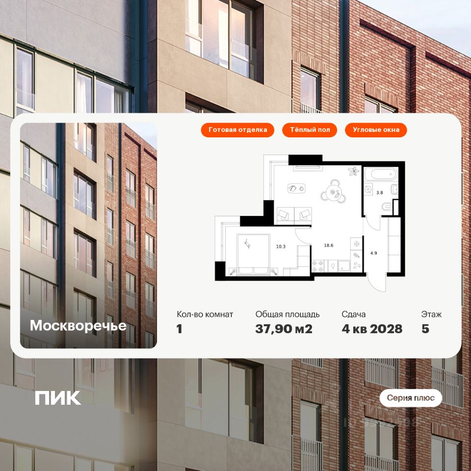 Продаётся 1-комн. квартира площадью 37,9 кв.м на 5 этаже 16 этажного дома (Корпус 2.3, Секция 5) проекта ПИК Москворечье. Светлый просторный подъезд на уровне земли, функциональная планировка, большие окна, c отделкой.