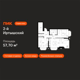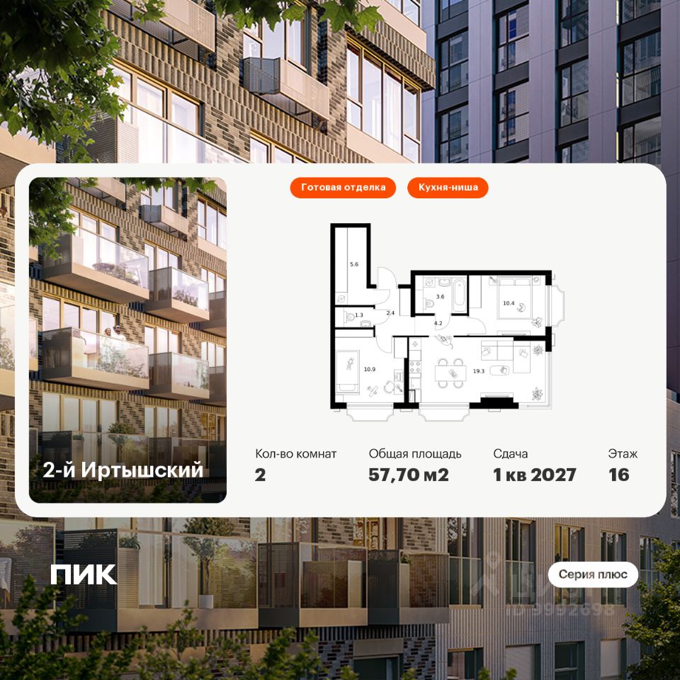 Продаётся 2-комн. квартира площадью 57,7 кв.м на 16 этаже 19 этажного дома (Корпус 1.2, Секция 2) проекта ПИК 2-й Иртышский. Светлый просторный подъезд на уровне земли, функциональная планировка, большие окна, c отделкой.