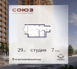 Продаётся квартира-студия площадью 29 м² на 7 этаже в Жилом Комплексе "Союз".