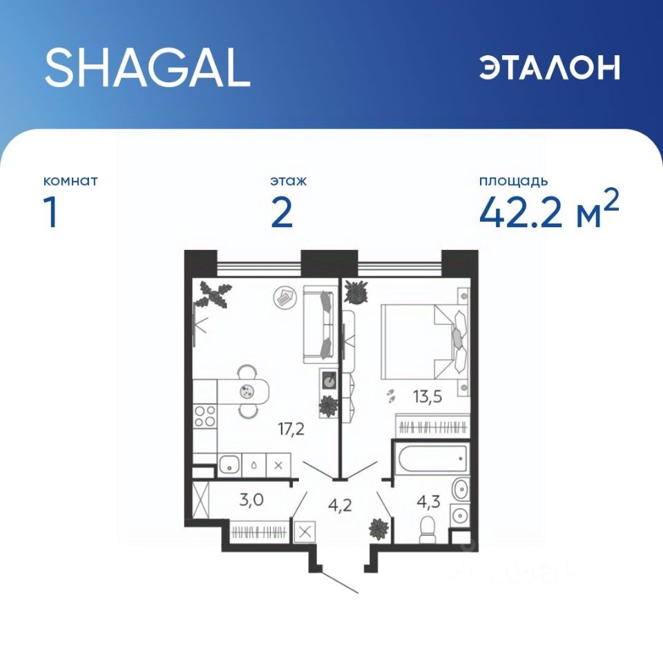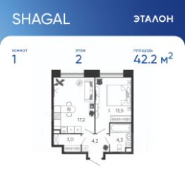 Общая площадь квартиры — 42.2 кв. м, этаж 2 из 12.