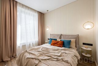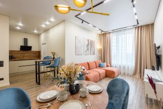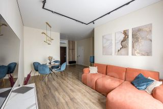 Квартира состоит из кухни-гостинной оборудованной диваном-кроватью пригдному для ежедневного сна, а так же функциональной кухней со всей встроенной бытовой техникой, комнатой-спальней (комната соборудованна полноценной двуспальной кроватью с ортопедическим матрасом и большой гардеробной, удобным рабочим местом), в ванной оборудован шкаф для стиральной машины и бытовой химии. Все фото реальные.