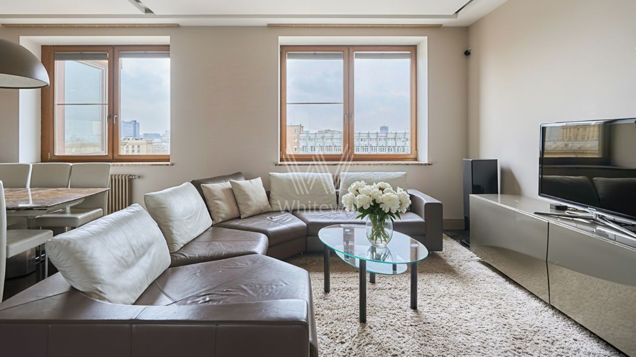 Квартира укомплектована мебелью и бытовой техникой. Планировка включает кухню-гостиную, мастер-спальню, вторую спальню, два санузла и лоджию. Из окон открываются виды на набережную Москвы-реки, здание МИДа и на переулки Арбата.