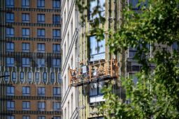 - Фасады облицованы плиткой теплых оттенков. Корзины для кондиционеров выполнены в тех же цветах, поэтому едва заметны.