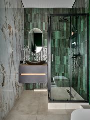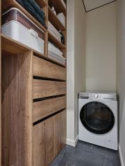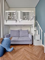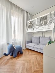 Просторная трехкомнатная квартира включает в себя светлую спальню, оборудованную современной техникой кухню-гостиную, уютную детскую, а также вместительную гардеробную, постирочную и два санузла.