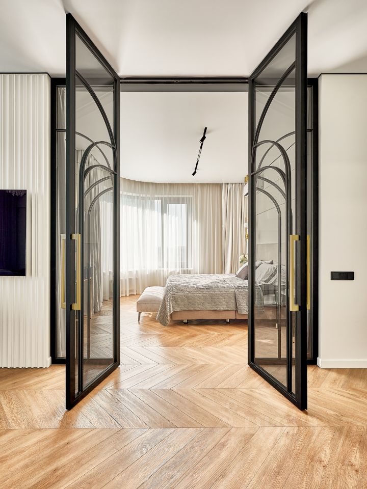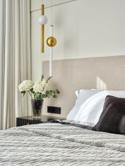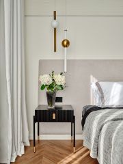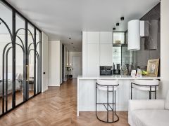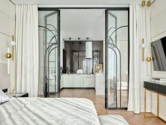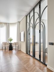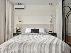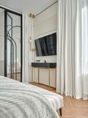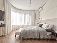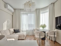 В интерьере использованы пастельные кремово-бежевые оттенки, идеально дополненные многочисленными сценариями освещения, высокие панорамные окна наполняют квартиру мягким естественным светом. Детали - изысканная перегородка в спальне, рельефные панели - придают интерьеру благородство и респектабельность, при этом техническое наполнение качественное и современное.
