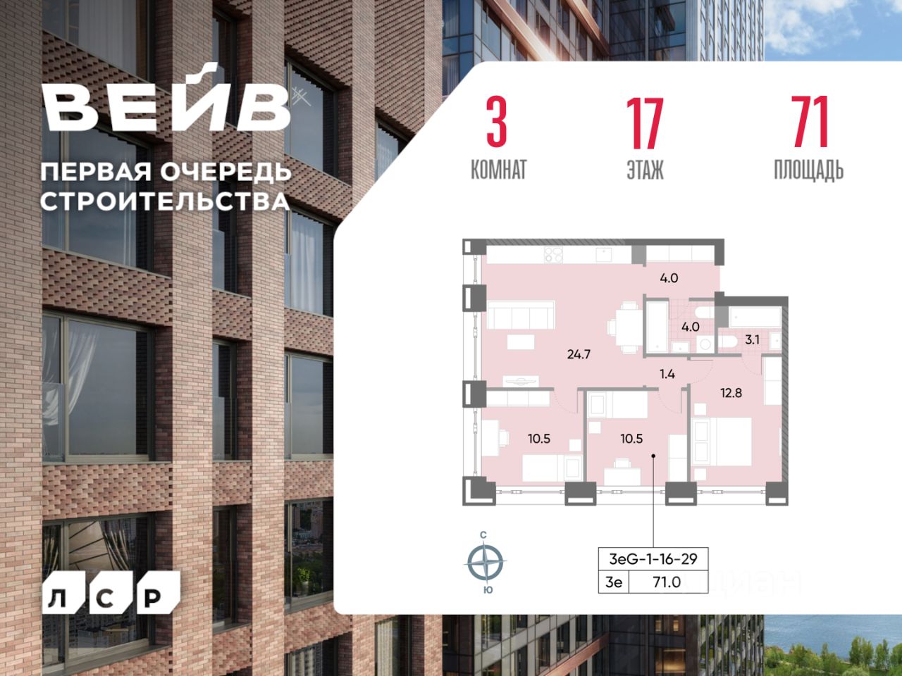 Продается 3-комнатная квартира общей площадью 71 кв. метров на 17 этаже жилого комплекса ВЕЙВ. Комплекс располагается на юге Москвы в районе Москворечье-Сабурово. В пешей доступности расположены станция МЦД "Москворечье" и станция метро "Борисово". Для автомобилистов есть удобное сообщение с Каширским шоссе.