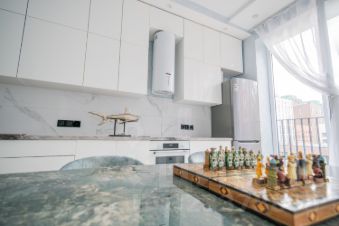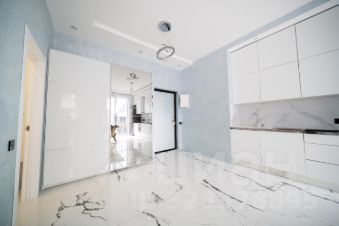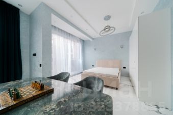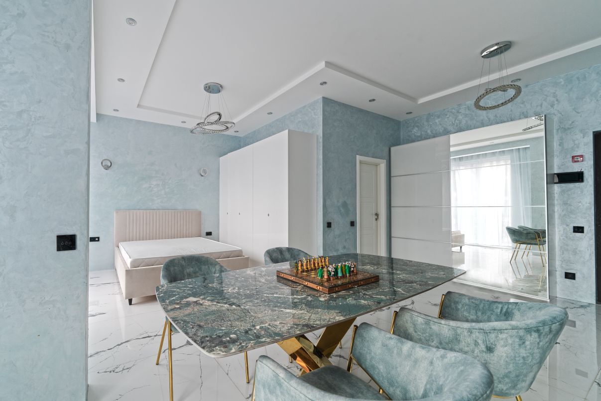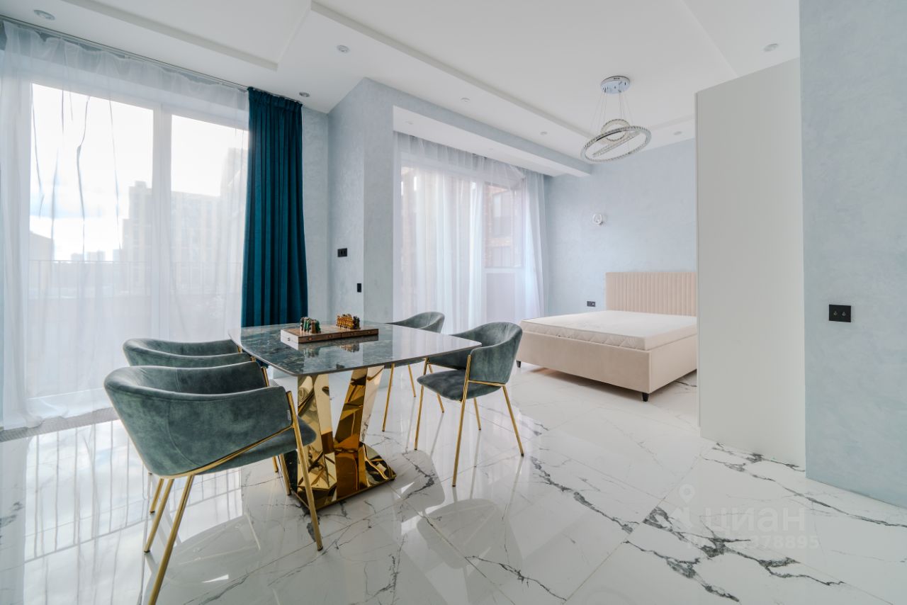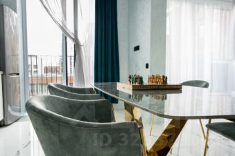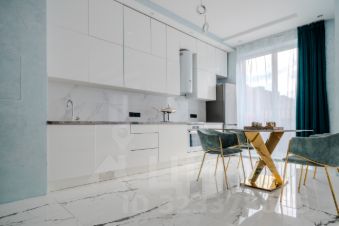 Площадь в 44 м2 занимают прихожая, кухня-гостиная и совмещенный санузел. Ремонт выполнен по авторскому дизайн-проекту. Квартира полностью меблирована, оснащена всей необходимой техникой и готова к проживанию. Ощущается очень светлой и просторной за счет высоких потолков (3.2 м), двух панорамных окон и грамотного цветового решения. Одним из главных преимуществ данного пространства можно назвать его расположение. Окна выходят во внутренний двор, поэтому в квартире всегда тихо.