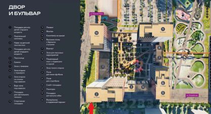 В комплексе будут жилые дома со своей уникальной архитектурой.На территории проекта представлены специальные тематические кварталы: спорт-квартал, дог-парк, скейт-парк, арт-квартал, тим-парк и сад-квартал. Главный элемент комплекса — пешеходный бульвар, окруженный зелеными зонами. Проектом предусмотрен детский сад на 350 мест и школа на 775 мест. На первых этажах комплекса расположена торговая галерея с магазинами и кафе. Для владельцев автомобилей предусмотрен подземный паркинг на 507 мест.