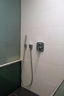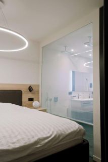 Два санузла один с двойной раковиной, душем/ванной с двумя лейками, а также натуральным дневным светом: стена душа в спальню из электрохроматического стекла, может быть матовой, а может прозрачной. Второй санузел с открытым душем. Вентиляция в санузлах автоматическая, включается по влажности.