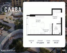 В продаже студия площадью 34.30 м² на 22-м этаже корпуса F.