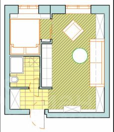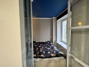 - Авторская перепланировка 2017 года подарила квартире фактические 26 кв.м жилого пространства вместо стандартных 20. Здесь есть отдельная спальня с двуспальной кроватью и просторная гостиная с кухонной зоной.