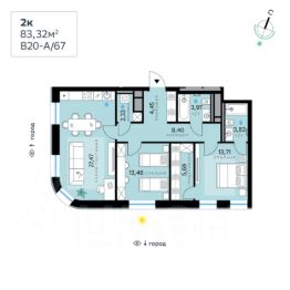 В продаже — двухкомнатная квартира с чистовой отделкой, общей площадью 83,32 кв. м. Квартира расположена на первом этаже одинадцатиэтажной секции дома класса Адвансд в новом районе СберСити, который строит Сбер. Дом находится на первой береговой линии Москвы-реки.