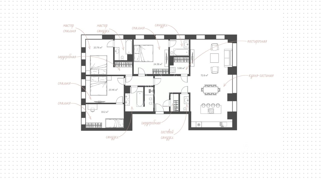 Просторная видовая квартира площадью 230 м² в клубном доме делюкс-класса Brodsky рядом с набережной Москвы-реки. Интерьер оформлен в лаконичных светлых тонах, на полу уложен паркет из тонированного дуба. Итальянская кухня Mk Cucine, встроенная техника Miele. Ванные комнаты отделаны натуральным мрамором, санфаянс Villeroy&Boсh. Планировка позволяет организовать светлую кухню-гостиную, три спальни, три санузла, постирочную, три гардеробные. Из панорамных окон в пол открываются живописные виды на город и башни "Москва-Сити".