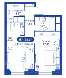 Просторная 2-комнатная квартира, 52,67 кв.м, на комфортном 6-м этаже в ЖК бизнес-класса "iLove".