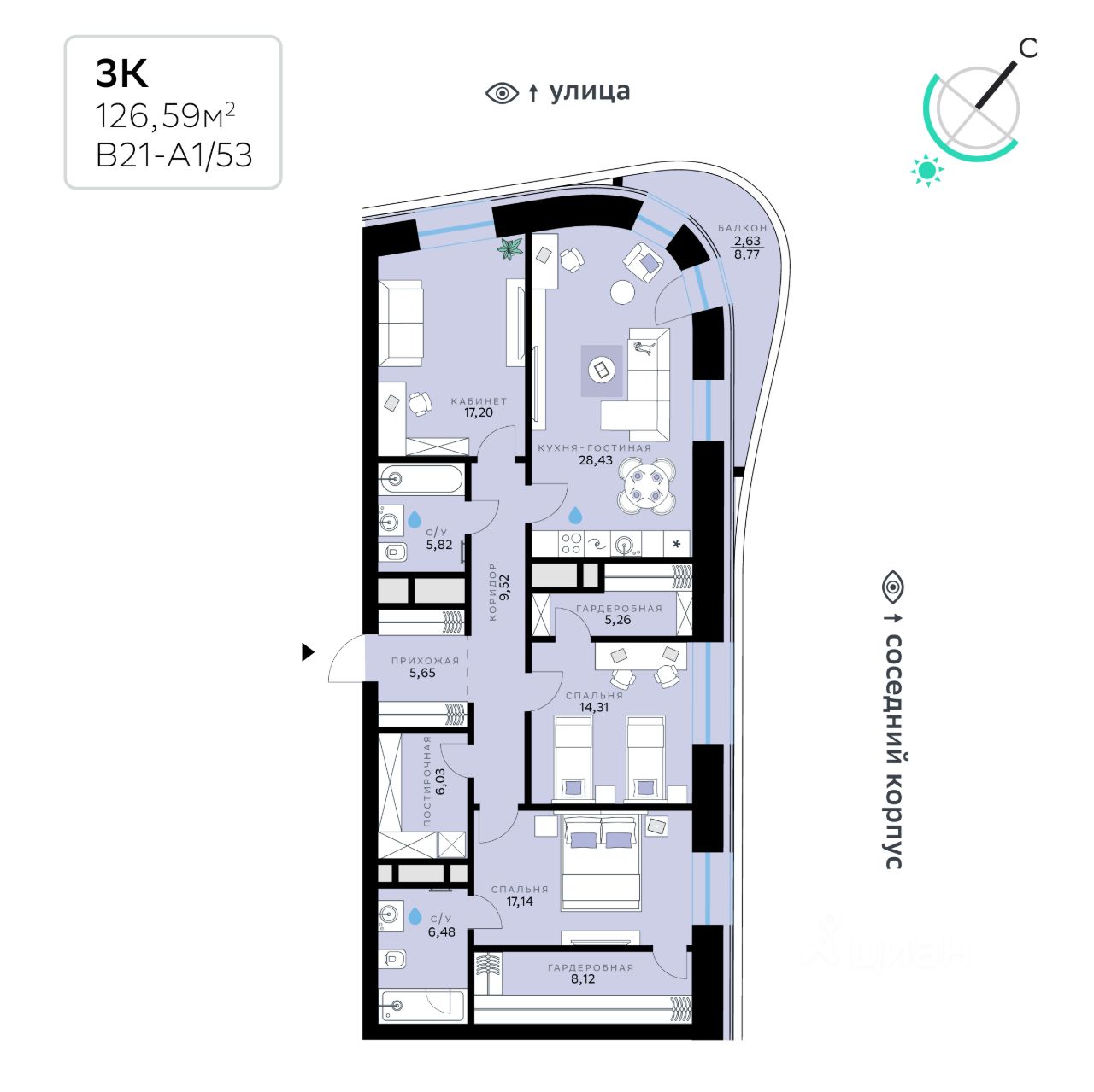 В продаже — трехкомнатная квартира с чистовой отделкой, общей площадью 126,59 кв. м. Квартира расположена на одинадцатом этаже одинадцатиэтажной секции корпуса класса Адвансд в новом районе СберСити, который строит Сбер. Дом находится на второй береговой линии Москвы-реки.
