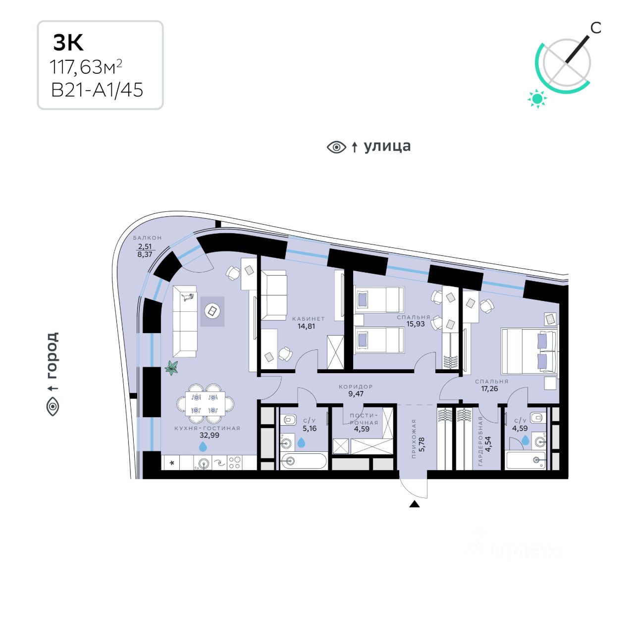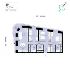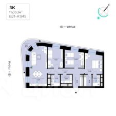 В продаже — трехкомнатная квартира с чистовой отделкой, общей площадью 117,63 кв. м. Квартира расположена на девятом этаже одинадцатиэтажной секции корпуса класса Адвансд в новом районе СберСити, который строит Сбер. Дом находится на второй береговой линии Москвы-реки.