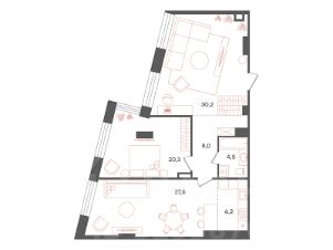 Просторная кухня-гостиная 33,8 кв.м, спальня 20,3 кв. м и светлая комната 30,2 кв.м, где можно собираться всей семьей. Все окна выходят в сторону улицы Ефремова, с видом на усадьбу Трубецких.
