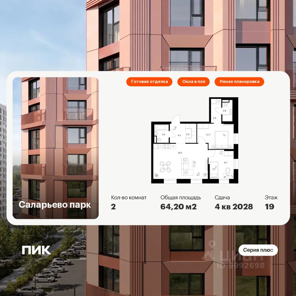 Продаётся 2-комн. квартира площадью 64,2 кв.м на 19 этаже 24 этажного дома (Корпус 82.7, Секция 7) проекта ПИК Саларьево парк. Светлый просторный подъезд на уровне земли, функциональная планировка, большие окна, c отделкой.
