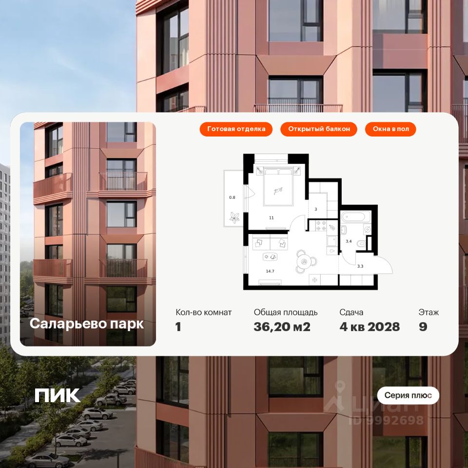 Продаётся 1-комн. квартира площадью 36,2 кв.м на 9 этаже 24 этажного дома (Корпус 82.7, Секция 7) проекта ПИК Саларьево парк. Светлый просторный подъезд на уровне земли, функциональная планировка, большие окна, c отделкой.