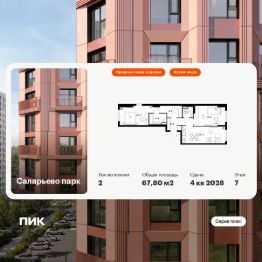 Продаётся 2-комн. квартира площадью 67,8 кв.м на 7 этаже 16 этажного дома (Корпус 82.5, Секция 5) проекта ПИК Саларьево парк. Светлый просторный подъезд на уровне земли, функциональная планировка, большие окна, предчистовая отделка.