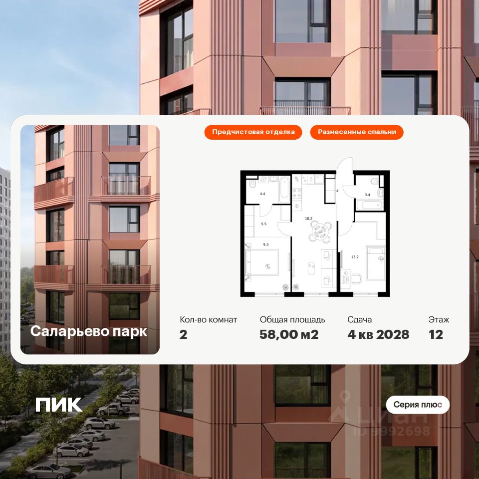 Продаётся 2-комн. квартира площадью 58 кв.м на 12 этаже 16 этажного дома (Корпус 82.5, Секция 5) проекта ПИК Саларьево парк. Светлый просторный подъезд на уровне земли, функциональная планировка, большие окна, предчистовая отделка.