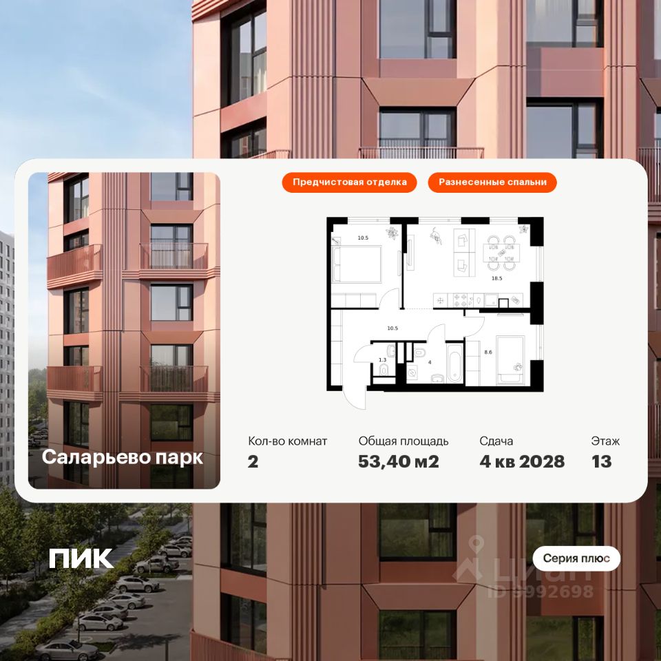 Продаётся 2-комн. квартира площадью 53,4 кв.м на 13 этаже 16 этажного дома (Корпус 82.5, Секция 5) проекта ПИК Саларьево парк. Светлый просторный подъезд на уровне земли, функциональная планировка, большие окна, предчистовая отделка.
