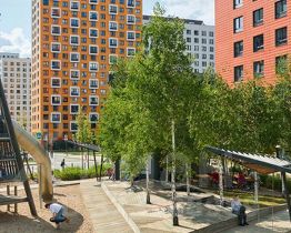 Все корпуса в квартале гармонично сочетаются, образуя единую городскую среду. Между собой их объединяет невысокая этажность и натуральная цветовая гамма. Здесь приятно гулять и проводить время на улице всей семьёй.