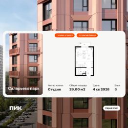 Продаётся квартира-студия площадью 29 кв.м на 3 этаже 16 этажного дома (Корпус 82.2, Секция 2) проекта ПИК Саларьево парк. Светлый просторный подъезд на уровне земли, функциональная планировка, большие окна, c отделкой.