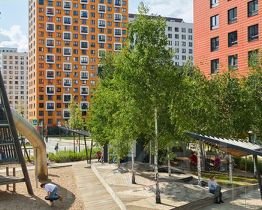 Все корпуса в квартале гармонично сочетаются, образуя единую городскую среду. Между собой их объединяет невысокая этажность и натуральная цветовая гамма. Здесь приятно гулять и проводить время на улице всей семьёй.
