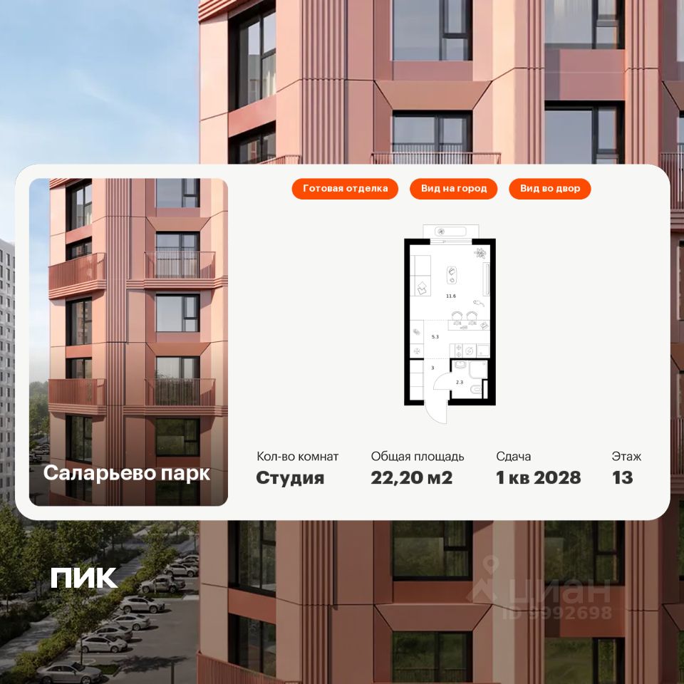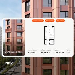 Продаётся квартира-студия площадью 22,2 кв.м на 13 этаже 18 этажного дома (Корпус 74.1, Секция 1) проекта ПИК Саларьево парк. Светлый просторный подъезд на уровне земли, функциональная планировка, большие окна, c отделкой.
