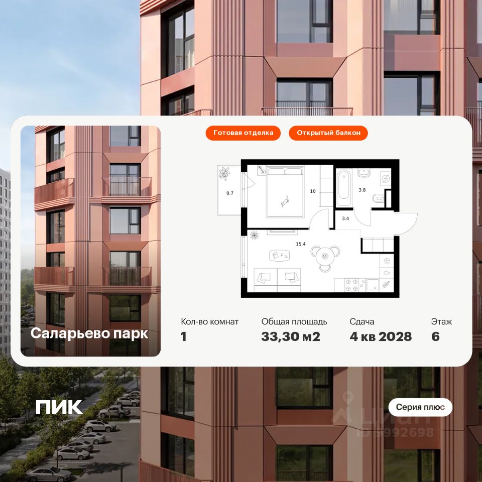 Продаётся 1-комн. квартира площадью 33,3 кв.м на 6 этаже 14 этажного дома (Корпус 82.6, Секция 6) проекта ПИК Саларьево парк. Светлый просторный подъезд на уровне земли, функциональная планировка, большие окна, c отделкой.