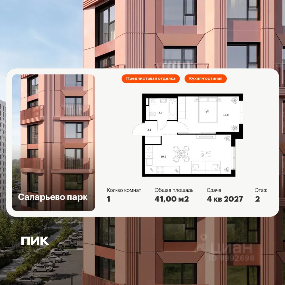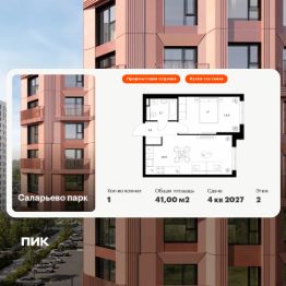 Продаётся 1-комн. квартира площадью 41 кв.м на 2 этаже 14 этажного дома (Корпус 57.5, Секция 5) проекта ПИК Саларьево парк. Светлый просторный подъезд на уровне земли, функциональная планировка, большие окна, предчистовая отделка.