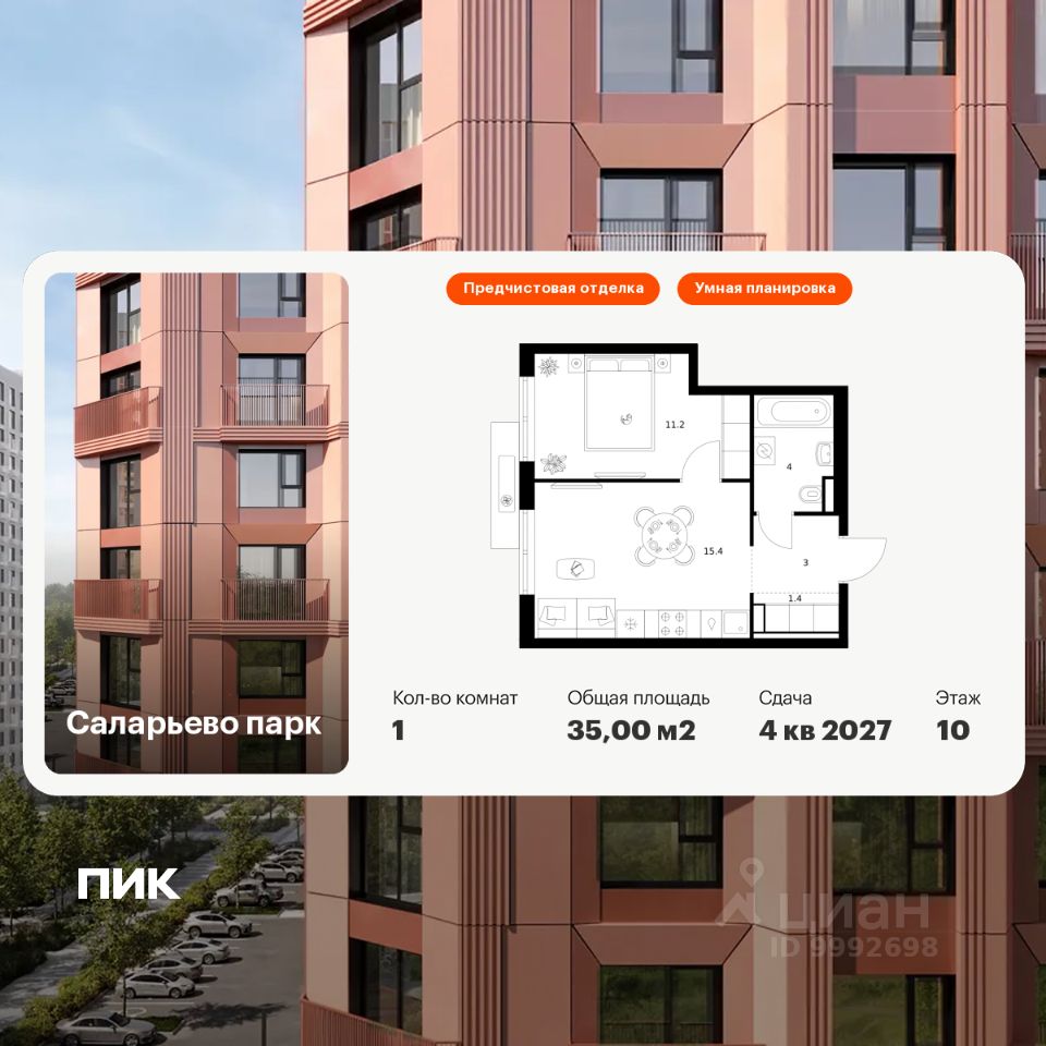 Продаётся 1-комн. квартира площадью 35 кв.м на 10 этаже 14 этажного дома (Корпус 57.5, Секция 5) проекта ПИК Саларьево парк. Светлый просторный подъезд на уровне земли, функциональная планировка, большие окна, предчистовая отделка.
