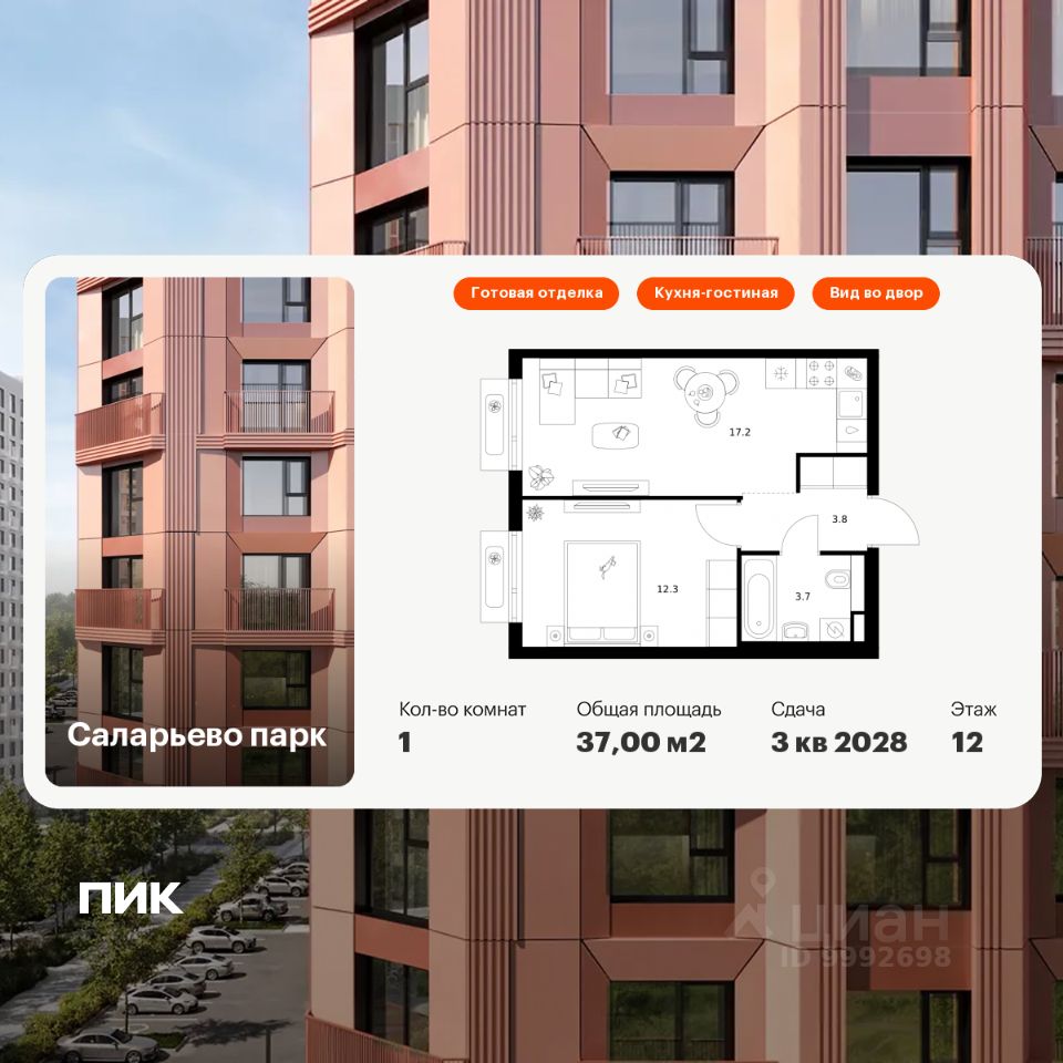 Продаётся 1-комн. квартира площадью 37 кв.м на 12 этаже 14 этажного дома (Корпус 69.7, Секция 7) проекта ПИК Саларьево парк. Светлый просторный подъезд на уровне земли, функциональная планировка, большие окна, c отделкой.