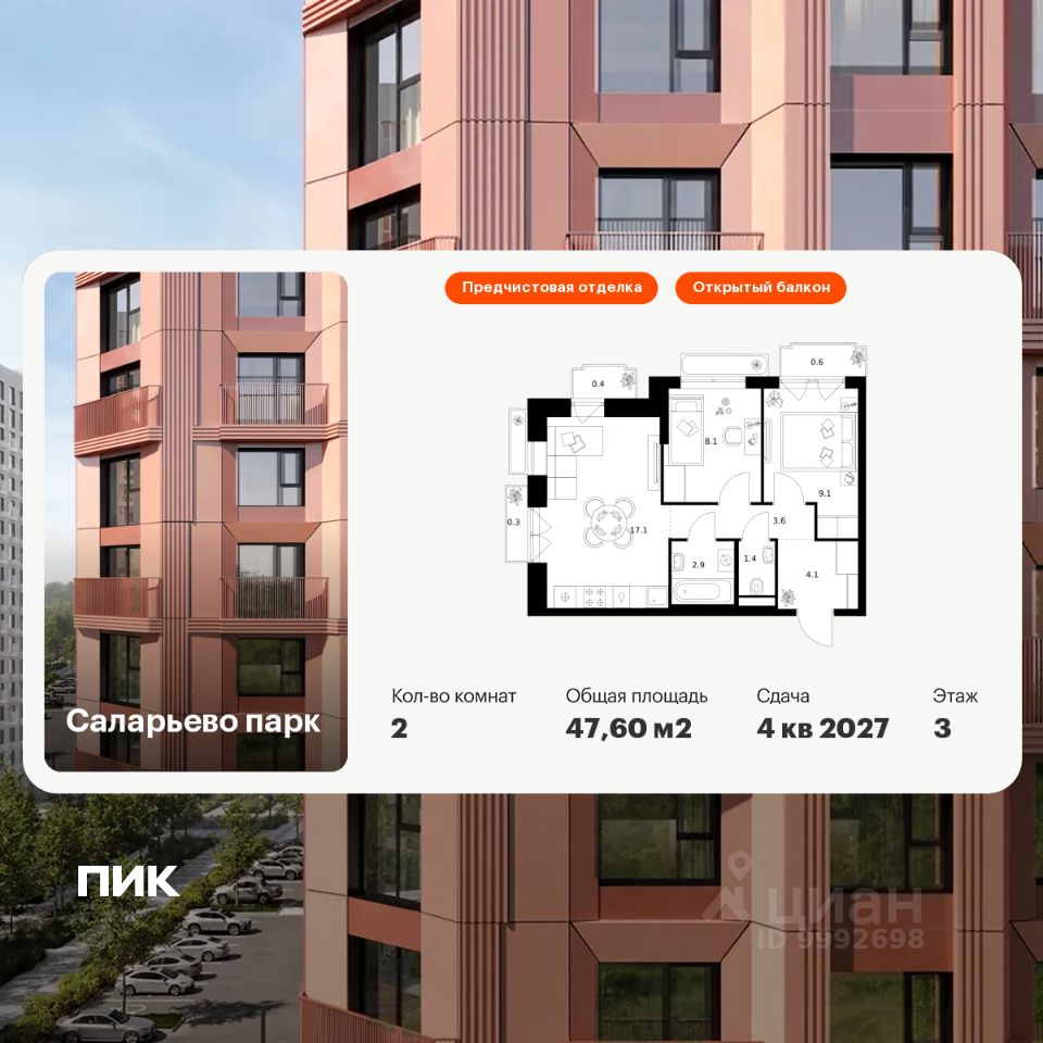 Продаётся 2-комн. квартира площадью 47,6 кв.м на 3 этаже 16 этажного дома (Корпус 57.4, Секция 4) проекта ПИК Саларьево парк. Светлый просторный подъезд на уровне земли, функциональная планировка, большие окна, предчистовая отделка.