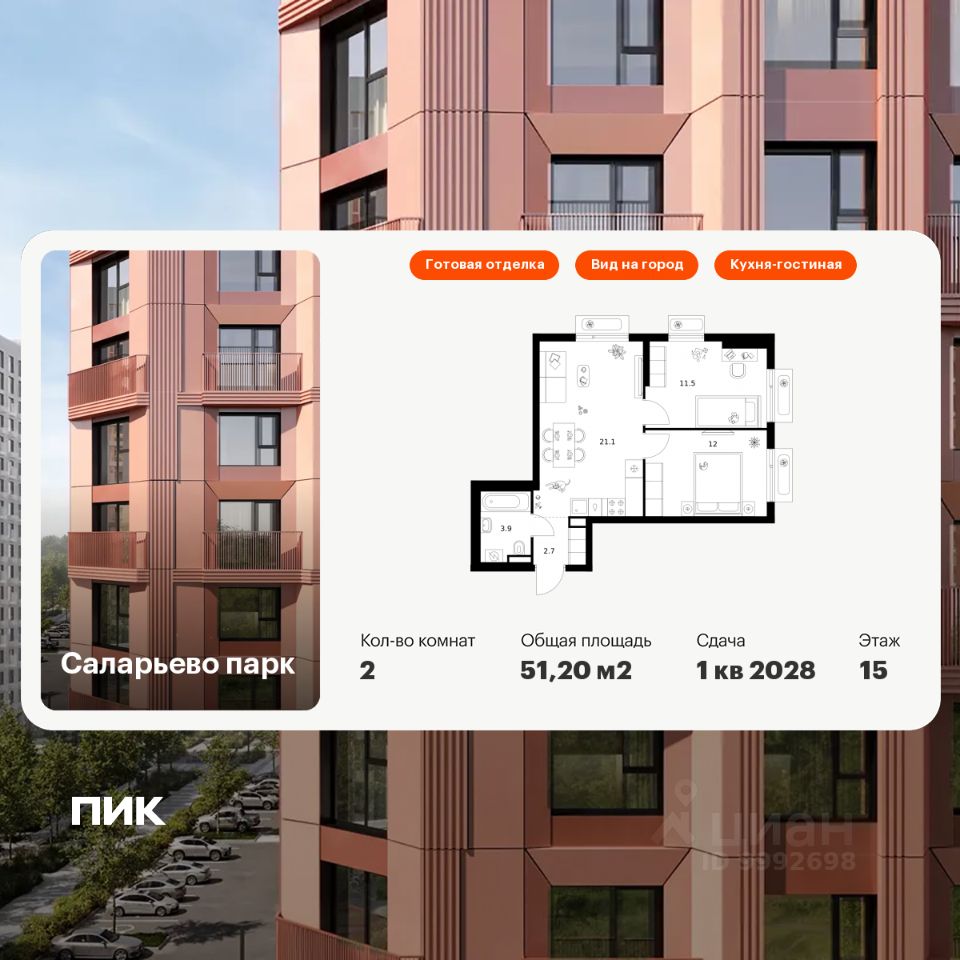 Продаётся 2-комн. квартира площадью 51,2 кв.м на 15 этаже 18 этажного дома (Корпус 74.9, Секция 9) проекта ПИК Саларьево парк. Светлый просторный подъезд на уровне земли, функциональная планировка, большие окна, c отделкой.