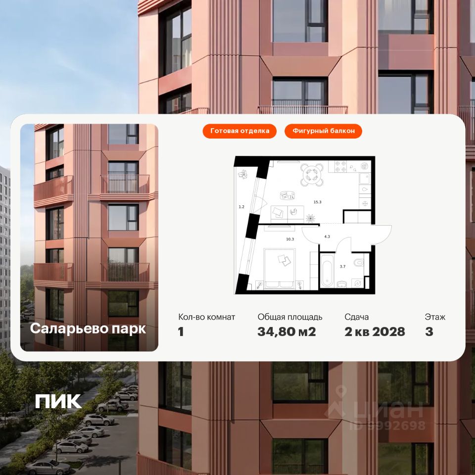 Продаётся 1-комн. квартира площадью 34,8 кв.м на 3 этаже 22 этажного дома (Корпус 73, Секция 1) проекта ПИК Саларьево парк. Светлый просторный подъезд на уровне земли, функциональная планировка, большие окна, c отделкой.
