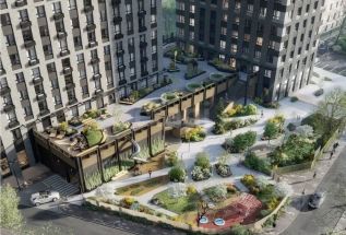 Просторный двор 5900 м² с зонами отдыха, летним кинотеатром, сценой для мероприятий, спортивными и детскими площадками, йога-площадкой и велопарковкой.