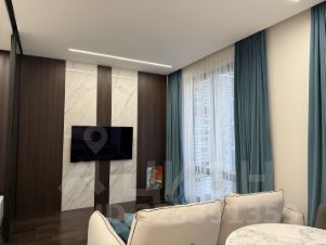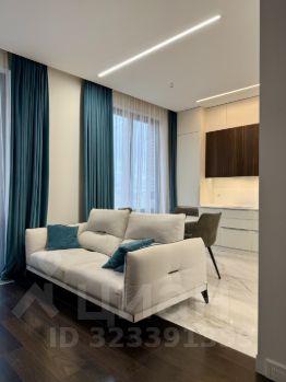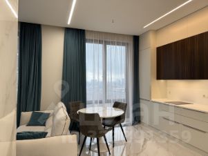 Просторная видовая квартира в ЖК Пресня Сити на 35 этаже. В квартире выполнен дизайнеский ремонт. Планировка включает в себя: кухню-гостинную, гардеробную комнату, ванную комнату, коридор и спальню. Спальня-ниша отделена межкомнатной перегородкой. Также в квартире выполнены: