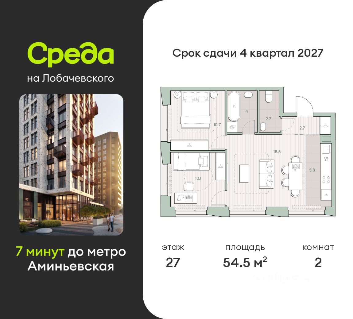 Продаётся 2-комнатная квартира общей площадью 54.5 кв.м. без отделки. Квартира расположена на 27 этаже корпуса 5.5 в жилом комплексе бизнес-класса "Среда на Лобачевского" в пешей доступности от метро "Аминьевская".