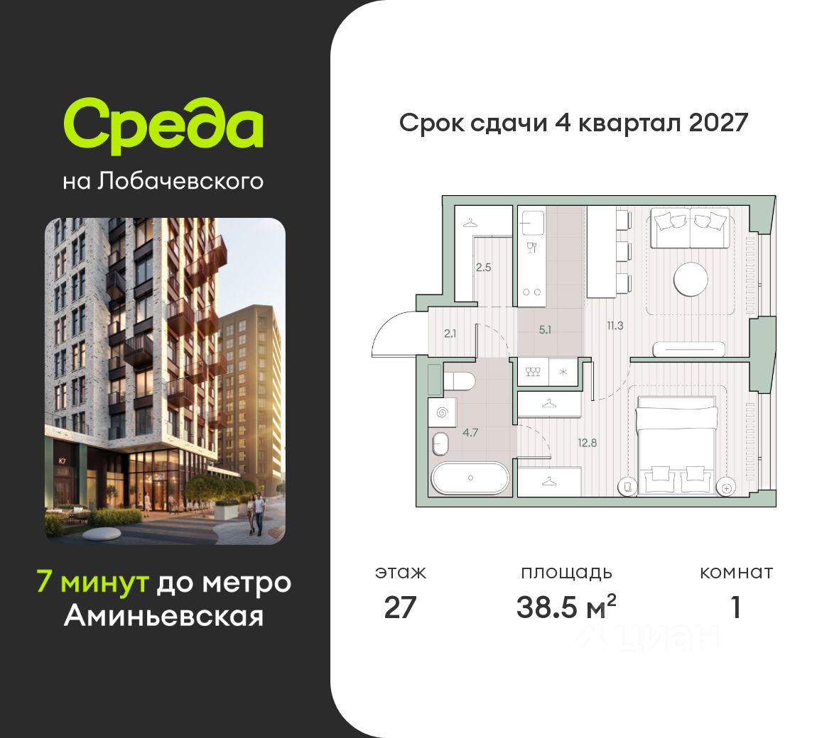 Продаётся 1-комнатная квартира общей площадью 38.5 кв.м. без отделки. Квартира расположена на 27 этаже корпуса 5.5 в жилом комплексе бизнес-класса "Среда на Лобачевского" в пешей доступности от метро "Аминьевская".