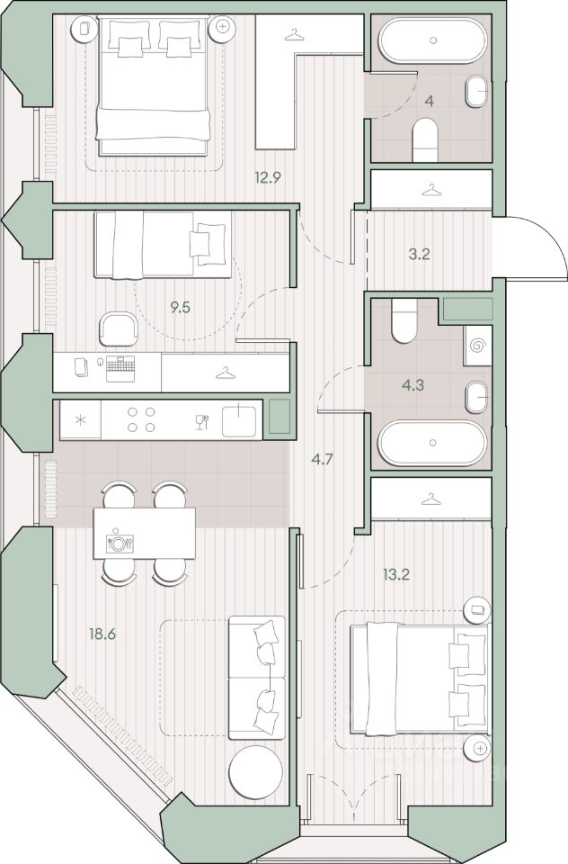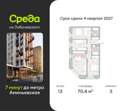 Продаётся 3-комнатная квартира общей площадью 70.4 кв.м. без отделки. Квартира расположена на 13 этаже корпуса 5.6 в жилом комплексе бизнес-класса "Среда на Лобачевского" в пешей доступности от метро "Аминьевская".